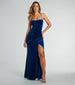 Luxe velvet fabric becomes even more enchanting thanks to the sparkly glitter on the Alexis formal dress! A dreamy look for banquets. prom. or red-carpet events this gown was made to shine. The cowl neckline and crisscross back add a touch of sophistication. while the adjustable spaghetti straps and flexible boning ensure a perfect fit. The high front wrap slit and floor-length mermaid silhouette create an elegant. high-end look everyone will admire! Complete the look in strappy rhinestone heels and earrings for extra luxe.