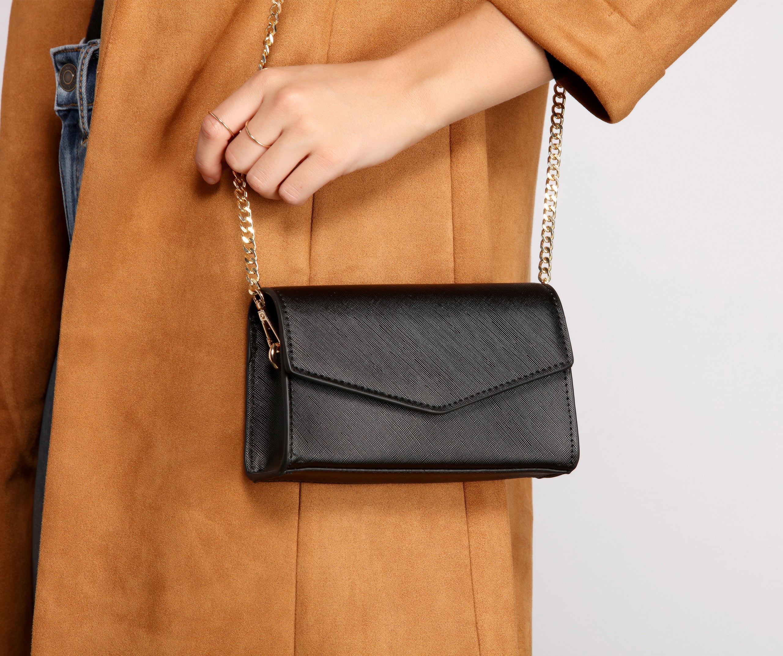 Bring it back to basics in a sleek crossbody! This must-have crossbody features a mini body. an envelope design. and a chain shoulder strap. Complete your look with a trench coat and high waist jeans for your next night out.Â
