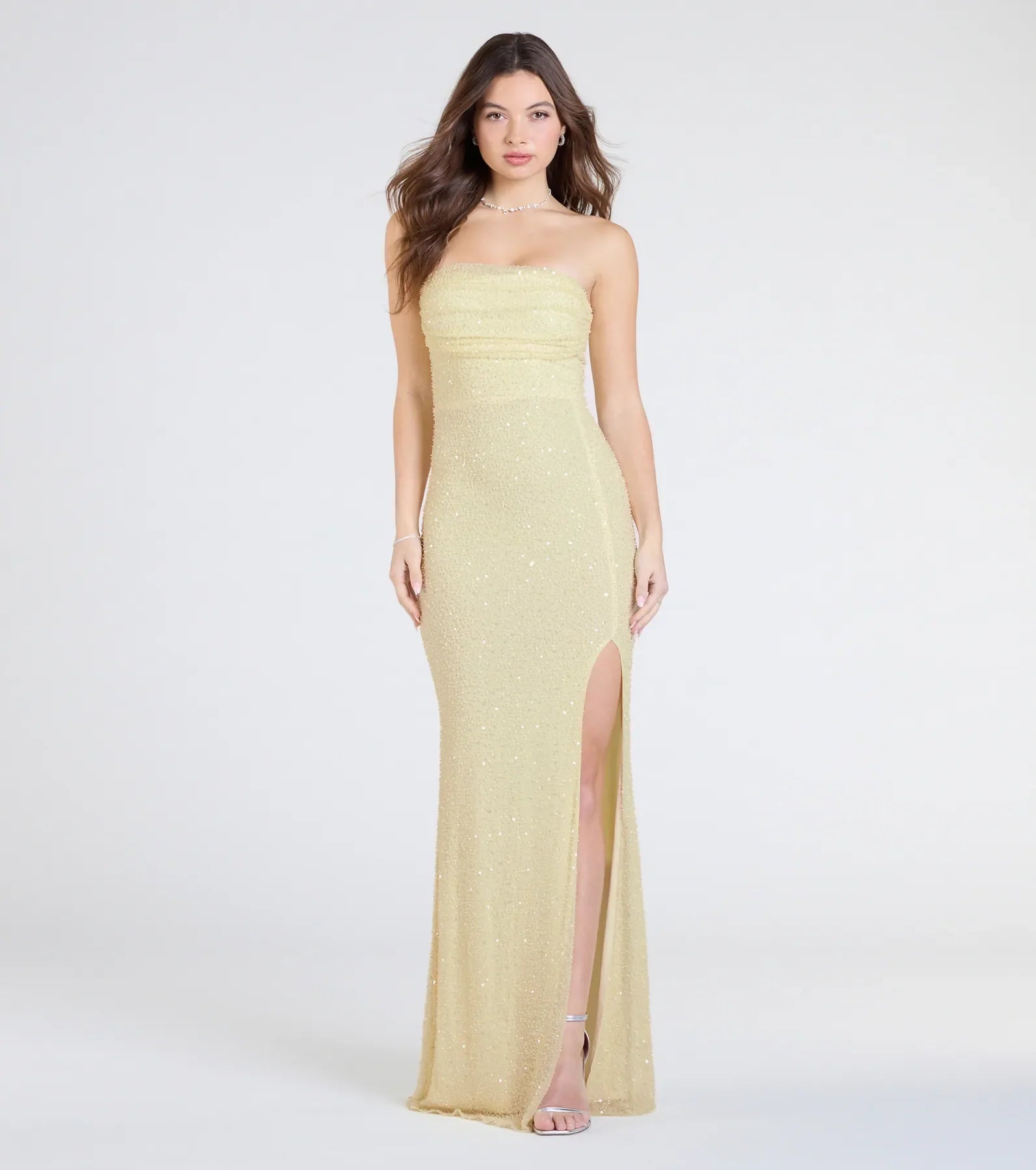 Waltz into the party in the Cindy beaded formal dress for a stunning look! The formal floor-length dress is designed with a strapless cowl neckline that shapes the fitted column silhouette showcasing a high front slit.