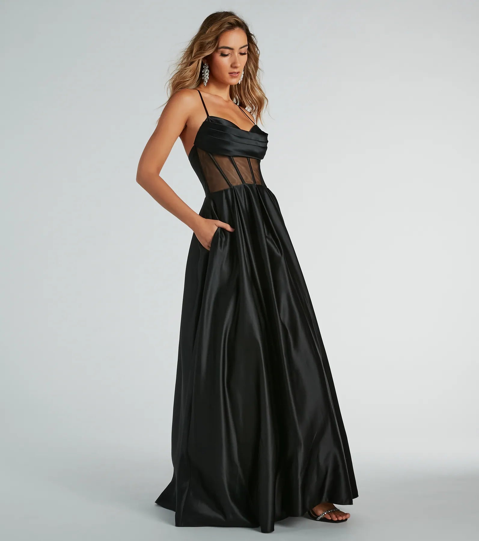 Standout at prom. birthdays. or black tie balls in the Georgina satin ball gown for a classy and sophisticated allure that captures all the attention! She features a stunning cowl pleated neckline. a padded bust for support. spaghetti straps. and a head-turning lace-up back design. Show some skin in the sheer corset bodice with flexible boning that creates a snatched look while her A-line silhouette is adorned with side pockets for keeping your hands warm. The floor-length ball gown is composed of a smooth woven satin fabric with multiple tulle and woven linings for a voluminous effect. Complete the look with chandelier earrings.