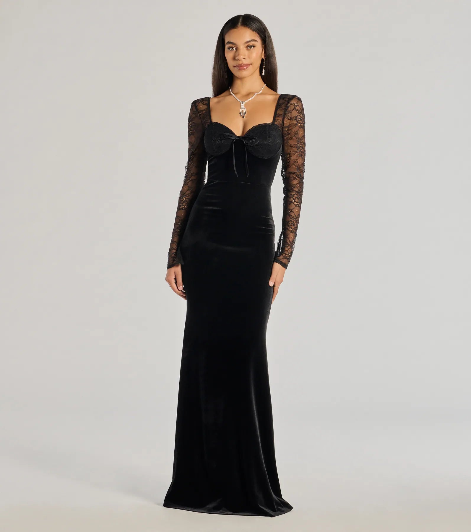 The Jaya long velvet dress features a sweetheart neckline with floral lace molded cups. sheer unlined lace long sleeves. and a floor-sweeping column silhouette. Complete your luxe look with a rhinestone clutch.