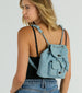 Get ready to rock your look with this quilted denim mini backpack perfect for festivals. concerts. or theme parks! Made with quilted denim material. this backpack is both stylish and functional. The adjustable shoulder straps ensure a comfortable fit. while the front flap pocket and spacious interior keep your essentials organized. Complete the look with a basic bodysuit and jeans!