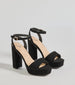 Get ready to slay in platform heels that take your look to the next level! These fab platforms feature an open back. an adjustable ankle strap. a peep toe. a wide platform. and a block heel. The heels are composed of a faux nubuck material. Complete the look with a bustier and high waist jeans.