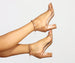 Sleek and chic. these posh patent faux leather heels are a definite must-have. They feature an open almond-shaped toe. a toe and ankle strap. a back zipper closure. and a block heel. Style these heels with dress pants and a chic blouse.